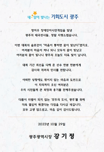 ÇÑÆí °±âÁ¤ ½ÃÀåÀº Ç×Àú¿ì Àå¾ÖÀξƽþȰÔÀÓ¿¡ ÃâÀüÇÑ 9°³ Á¾¸ñ 20¸íÀÇ ±¤Áֽà ¼Ò¼Ó ¼±¼öµé¿¡°Ô ÀÀ¿øÀÇ °Ý·Á Ä«µå¸¦ º¸³Â´Ù. ¶Ç ´ëȸ¿¡¼ ¸Þ´ÞÀ» ȹµæÇÑ ¼±¼öµé¿¡°Ô ¡°¼±¼öµé °ç¿¡ ±¤ÁֽùÎÀÌ ÀÖ°í ½ÃÀåÀÌ ÀÖ´Ù¡±¸ç ¡°¿©·¯ºÐÀÌ ÀÚ¶û½º·´°í °í¸¿´Ù. °Ç°ÇÑ ¸ð½ÀÀ¸·Î ±Í±¹Çؼ ¸¸³ªÀÚ¡±´Â ÃàÇϸ޽ÃÁö¸¦ ÀüÇß´Ù.