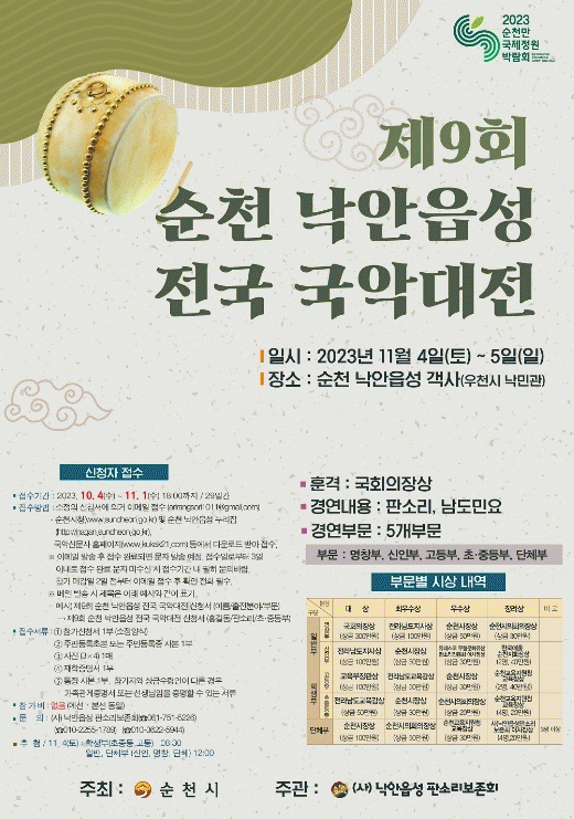 ¿ÃÇØ·Î 9ȸ°¸¦ ¸ÂÀÌÇÏ´Â ¼øÃµ ³«¾ÈÀ¾¼º Àü±¹ ±¹¾Ç´ëÀüÀº µ¿ÆíÁ¦ÀÇ °ÅÀå ±¹Ã¢ ¼Û¸¸°© ¼±»ý´ÔÀÇ ÆÇ¼Ò¸®¸¦ °è½ÂÇϰí, ±¹³» ±¹¾Ç ½ÅÀÎÀ» ¹ß±¼¡¤À°¼ºÇÏ´Â ±ÇÀ§ ÀÖ´Â ±¹¾Ç µî¿ë¹®À¸·Î ÀÚ¸®¸Å±èÇϰí ÀÖ´Ù.