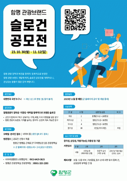 °ø¸ðÀü Âü°¡ ½ÅûÀº °ø¸ðÀü Àü¹® ¿Â¶óÀÎ Ç÷§ÆûÀÎ ¡®¾Å±Â¡¯°ú QRÄڵ带 ÅëÇØ ¿Â¶óÀÎ, ¸ð¹ÙÀÏ·Î ½ÅûÇϰųª ÇÔÆò±º ȨÆäÀÌÁö °í½Ã¡¤°ø°í¶õÀÇ ½½·Î°Ç °ø¸ðÀü¿¡¼ ½Åû¼¸¦ ´Ù¿î¹Þ¾Æ ÇÔÆò±º °ü±¤Á¤Ã¥½Ç·Î Á÷Á¢ ¹æ¹® Á¦ÃâÇÏ¸é µÈ´Ù.