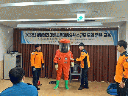 À̳¯ ´ã¾ç±º º¸°Ç¼Ò¿Í °ü°è±â°ü ¹× Ÿ ½Ã.±º °ü°èÀÚ 60¿© ¸íÀÌ Âü¼®ÇÑ °¡¿îµ¥ ÁøÇàµÈ ÈÆ·Ã¿¡¼´Â »ý¹°Å×·¯ ÀÇ½É »ç·Ê ¹ß»ý ½Ã ½Å¼ÓÇϰí Á¤È®ÇÑ ´ëÀÀÀ» À§ÇØ »ý¹°Å×·¯ ´ëºñ¿Í Ãʵ¿ Á¶Ä¡¿¡ ´ëÇÑ ÀÌ·Ð ±³À°°ú ÇÔ²² °Ëü äÃë, °Ëü ¼ö¼Û ¿ë±â Æ÷Àå ¹× À̼Û, °³ÀÎ º¸È£º¹(Level A, C) Âø¡¤Å»ÀÇ µî ½Ç½ÀÇü ÈÆ·ÃÀ» ÁøÇàÇß´Ù.