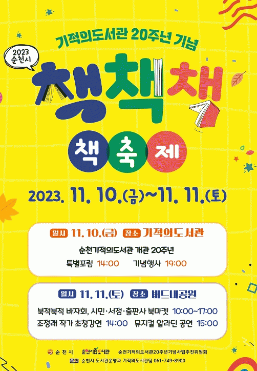 11ÀÏÀº ¡®Àç¹ÌÀÖ´Â ³¯¡¯·Î ¹öµå³»°ø¿ø ÀÏ¿ø¿¡¼ ¡®2023 ¼øÃµ½Ã Ã¥¡¤Ã¥¡¤Ã¥ Ã¥ÃàÁ¦¡¯°¡ ÆîÃÄÁø´Ù. ¾î¸°À̵éÀÌ Âü¿©ÇÏ´Â ÆÛ·¹ÀÌµå ¡®±âÀûÀÇ ¾ÆÀ̵顯·Î Çà»çÀÇ ¹®À» ¿°í Á¶Á¤·¡ ÀÛ°¡(±âÀûÀǵµ¼°ü ¸í¿¹°üÀå) ÃÊû °¿¬, µ¿¸íÃÊ ¾î¸°À̵éÀÇ ¡®¿Ë°íÁýÀü¡¯ÃàÇϰø¿¬, ¹ÂÁöÄà ¾Ë¶óµò, ·Îº¿ ´í½º ÆÛÆ÷¸Õ½º, dz¼± ¿¹¼ú µî ´Ùä·Î¿î Çà»ç°¡ ¿¹Á¤µÇ¾î ÀÖ´Ù.