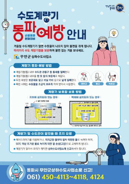 »óÇϼöµµ»ç¾÷¼Ò °ü°èÀÚ´Â ¡°µ¿ÆÄ ÇÇÇØ ¹æÁö¸¦ À§ÇØ Çå ¿Ê µîÀÇ º¸¿ÂÀç·Î °è·®±âÅëÀ» ä¿ö Âù °ø±â°¡ ½º¸çµéÁö ¾Êµµ·Ï Çϰí, ÇÑÆÄ°¡ Áö¼ÓµÉ ¶§´Â ¼öµ¾¹°À» Á¶±Ý¾¿ È帣°Ô ÇØ µ¿ÆÄ¸¦ ¿¹¹æÇÏ¿©¾ß Çϸç, ¸¸¾à °è·®±â°¡ ¾ó¾úÀ» °æ¿ì Çì¾îµå¶óÀ̾ ÀÌ¿ëÇϰųª, ¹ÌÁö±ÙÇÑ ¹°ºÎÅÍ Á¡Â÷ µû¶æÇÑ ¹°À» ÀÌ¿ëÇØ ³ì¿©¾ß ÇÑ´Ù¡±°í ´çºÎÇß´Ù.
