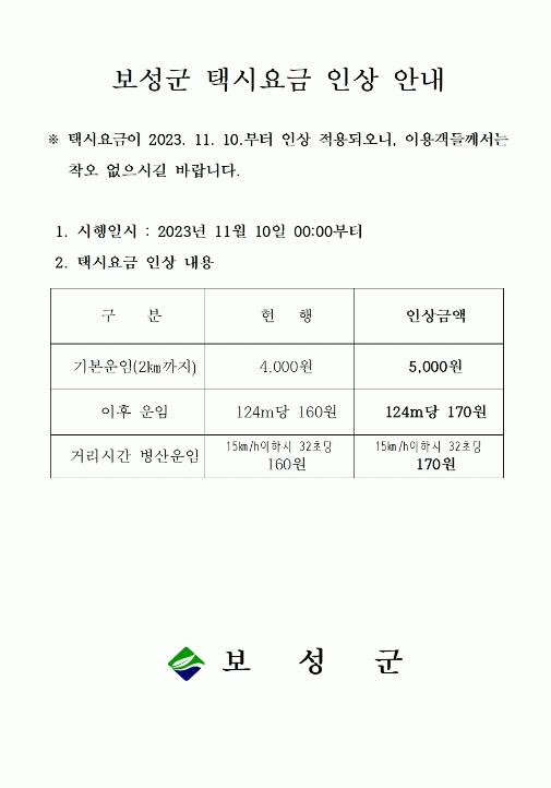 ÀÌ¿¡ µû¶ó ±ºÀº Àü¶ó³²µµ ÅýÿîÀÓ°ú ¿äÀ² ±âÁØ, Àӱݡ¤¹°°¡ »ó½Â·ü µî ¿î¼Û¿ø°¡ »ó½Â°ú Åýà ¾÷°èÀÇ °æ¿µ³ µîÀ» °í·ÁÇØ ±âº»¿ä±Ý(2km)Àº ±âÁ¸ 4,000¿ø¿¡¼ 5,000¿øÀ¸·Î ¿À¸¥´Ù. ¿ä±Ý ÀλóÀº 2019³â 5¿ù ÀÌÈÄ 4³â ¸¸ÀÌ´Ù.