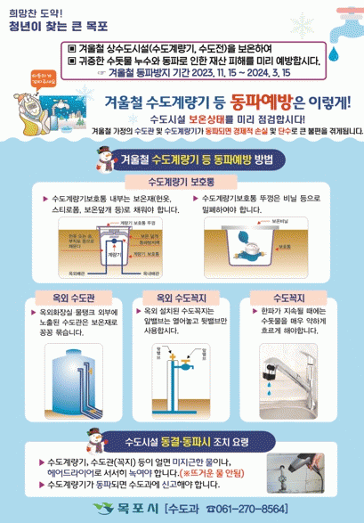 ½Ã´Â °Ü¿ïö µ¿ÆÄ, µ¿°á ¿¹¹æ°ú Á¶Ä¡ ¹æ¹ýÀ¸·Î ¼öµµ°è·®±â¿Í ¿ÜºÎ·Î µå·¯³ª ÀÖ´Â ¼öµµ°üÀ» Çå¿Ê, ½ºÆ¼·ÎÆû, Çë°Ò µîÀ¸·Î °¨½Î Âù¹Ù¶÷ÀÌ µé¾î°¡Áö ¾Êµµ·Ï µû¶æÇÏ°Ô º¸¿ÂÀ» ÇØÁÖ¾î¾ß ÇÑ´Ù°í °Á¶Çß´Ù.