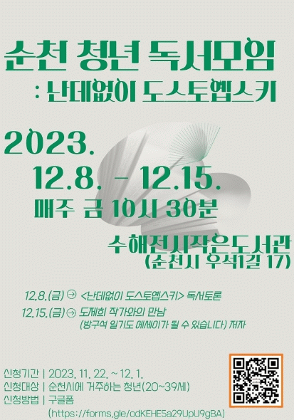 12¿ù 8ÀÏÀº Á¤Áö¼± °»ç°¡ µµÁ¦Èñ ÀÛ°¡ÀÇ '³µ¥¾øÀÌ µµ½ºÅ俽½ºÅ°'¸¦ ÁÖÁ¦·Îºñ°æÀï µ¶¼Åä·ÐÀ» ÁøÇàÇÑ´Ù. 12¿ù 15ÀÏÀº '³µ¥¾øÀÌ µµ½ºÅ俽½ºÅ°'ÀÇ ÀúÀÚÀÎ µµÁ¦Èñ ÀÛ°¡¸¦ Á÷Á¢ ¸¸³ª À̾߱⠳ª´©´Â ÀÛ°¡ ºÏÅäÅ©¸¦ ¿î¿µÇÑ´Ù.