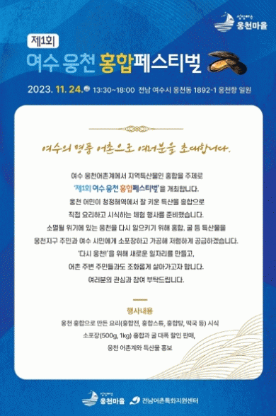 ¿©¼ö ¿õõ°è(±èä°ü °èÀå)°¡ ÁÖÃÖÇÏ´Â À̹ø Çà»ç´Â Àü³²¾îÃÌÆ¯ÈÁö¿ø¼¾ÅÍÀÇ Áö¿øÀ» ¹Þ¾Æ ¿õõ Ư»êǰÀÎ ±¼, È«ÇÕ µîÀ» Ȱ¿ëÇÑ ´Ù¾çÇÑ À½½Ä°ú »óǰµéÀ» ¼±º¸ÀδÙ.