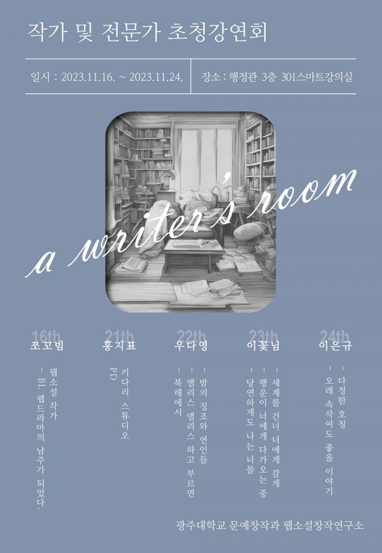 ÇÑÆí ±¤ÁÖ´ëÇб³ ¹®¿¹Ã¢ÀÛ°ú´Â ¹®Çп¡ °ü½É ÀÖ´Â ÀçÇлýµéÀ» ´ë»óÀ¸·Î ¸Å³â ÀÛ°¡ ÃÊû Ư°À» ¿°í ÀÖ´Ù. 11¿ù 21ÀÏÀº Ű´Ù¸® ½ºÆ©µð¿ÀÀÇ È«ÁöÇ¥ PD, 22ÀÏÀº ¿ì´Ù¿µ ¼Ò¼³°¡, 23ÀÏÀº ÀÌ²É´Ô ¼Ò¼³°¡, 24ÀÏÀº ÀÌÀº±Ô ½ÃÀÎÀ» °¢°¢ ÃÊûÇÑ´Ù.