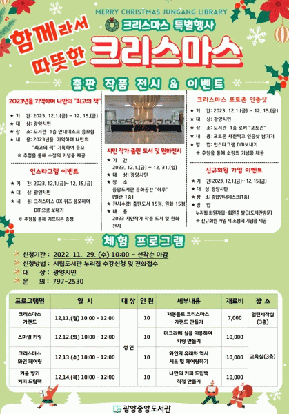 Å©¸®½º¸¶½º ½ÃÁðÀ» ¸Â¾Æ µµ¼°üÀ» ã´Â ½Ã¹Îµé¿¡°Ô üÇè ÇÁ·Î±×·¥°ú ´Ù¾çÇÑ À̺¥Æ®¸¦ ÅëÇØ Áñ°Å¿òÀ» ¼±»çÇϰí 2023³â ź»ýÇÑ ½Ã¹ÎÀÛ°¡µéÀÇ Ãâ°£ÀÛǰ°ú ¿øÈ¸¦ Àü½ÃÇØ dz¼ºÇÑ º¼°Å¸®¸¦ Á¦°øÇÒ °èȹÀÌ´Ù.
