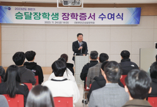 ÀÌ»çÀåÀÎ ±è»ê ±º¼ö´Â ¡°ÀåÇлýµéÀÌ ¹«¾È±º¹ÎµéÀÇ Á¤¼ºÀ¸·Î ¸ð¾ÆÁø ÀåÇбÝÀÇ Àǹ̸¦ ±â¾ïÇÏ°í µÇ»õ°Ü Çо÷¿¡ Á¤ÁøÇÏ¿© ¹«¾È±ºÀÇ ¹Ì·¡¸¦ ¹àÈ÷´Â Áö¿ª ÀÎÀç°¡ µÇ±â¸¦ ¹Ù¶õ´Ù¡±¸ç ¡°½Â´ÞÀåÇÐȸ´Â Çо÷À» À̾°¡´Â ¿ì¸® Áö¿ª ÇлýµéÀÇ ÈûÂù µµÀüÀ» Àû±ØÀûÀ¸·Î ÀÀ¿øÇϰí Áö¿øÇϰڴÙ. ¾ÕÀ¸·Îµµ º¯ÈÇÏ´Â ¹Ì·¡¸¦ À̲ø¾î°¥ µçµçÇϰí ÈǸ¢ÇÑ ÀÎÀç·Î ¼ºÀåÇØÁÖ±æ ¹Ù¶õ´Ù¡±°í ÀüÇß´Ù.