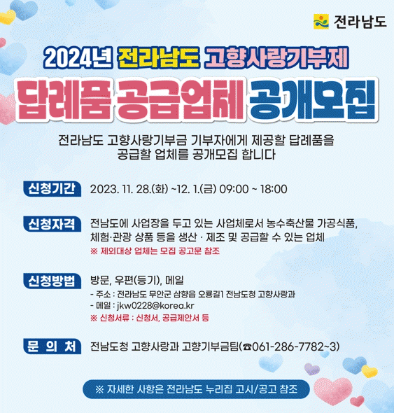´ä·Êǰ °ø±Þ¾÷ü ¸ðÁýÀº 12¿ù 1ÀÏ ¿ÀÈÄ 6½Ã±îÁö¸ç, Àü³²µµÃ» °íÇâ»ç¶û°ú¿¡ Á÷Á¢ ¹æ¹® ¶Ç´Â ¸ÞÀÏÀ» ÅëÇØ ½Åû °¡´ÉÇÏ´Ù.