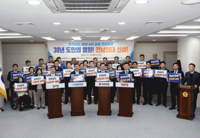 À̾î Àü³² ¿©¾ß 4´ç À§¿øÀåÀº ¡°¿À·£ ±â°£ ÀÇ·á±âº»±ÇÀÇ Â÷º°À» °Þ°í ÀÖ´Â Àü¶ó³²µµÀÇ ±¹¸³ Àǰú´ëÇÐ ½Å¼³¿¡ ¿©¾ß°¡ µû·Î ÀÏ ¼ö ¾ø¾î Àü³² ¿©¾ß 4´çÀÌ ¿À´Ã ÀÌ ÀÚ¸®¿¡ ÇÔ²² ¸ð¿´´Ù¡±°í ±âÀÚȸ°ßÀÇ ÃëÁö¸¦ ÀüÇϸç, ¡°Á¤ºÎ´Â ÀÇ´ë Áõ¿ø°èȹ¿¡ Áö¿ªÀÇ´ë ½Å¼³ ¹æÄ§À» Æ÷ÇÔÇϰí 2025³âµµ ÀÇ´ë Áõ¿øºÐ¿¡ ½Å¼³Á¤¿øÀ» ¹èÁ¤ÇÒ °Í¡±À» Á¤ºÎ¿¡ °£°îÈ÷ °ÇÀÇÇß´Ù.