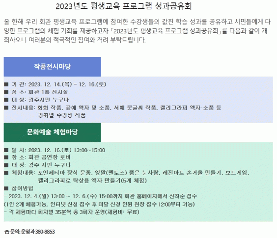±¤ÁÖÇлý±³À°¹®Èȸ°ü ±è¿ëÀÏ °üÀåÀº ¡°À̹ø ¼º°ú°øÀ¯È¸°¡ ¼ö°»ýµéÀÌ ¼ºÃë°¨°ú Áö¼ÓÀûÀÎ ÇнÀ µ¿±â°¡ µÇ±æ ¹Ù¶õ´Ù¡±¸ç ¡°¶Ç Æò»ý±³À°¿¡ ´ëÇÑ ½Ã¹ÎµéÀÇ Âü¿©°¡ ´õ¿í È®´ëµÇ´Â °è±â°¡ µÆÀ¸¸é ÇÑ´Ù¡±°í ¹àÇû´Ù.