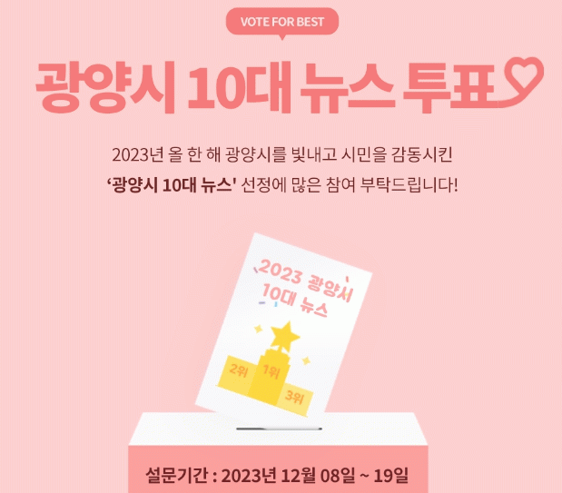 ¼³¹®Á¶»ç´Â 12¿ù 8ÀϺÎÅÍ 19ÀϱîÁö 12Àϰ£ ±¤¾ç½ÃÁ¤¿¡ °ü½ÉÀÖ´Â ´©±¸³ª ±¤¾ç½Ãû ȨÆäÀÌÁö(½Ã¹ÎÂü¿©¡æ¼³¹®Á¶»ç) ¶Ç´Â ³×À̹ö ÆûÀ» À»' ÅëÇØ Âü¿© °¡´ÉÇÏ´Ù.