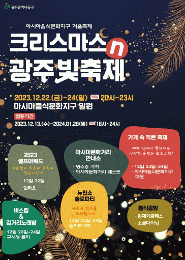 ÃàÁ¦´Â 13ÀÏ ¿ÀÈÄ 6½Ã Á¡µî Çà»ç¸¦ ½ÃÀÛÀ¸·Î ³»³â 1¿ù 28ÀϱîÁö ¡ã±Ý³²°ø¿øºÎÅÍ ¿þµùÀǰŸ® õº¯±îÁö ¹ãÇÏ´ÃÀ» ¼ö³õ´Â °¡·Î¼ö Á¶¸í ¡ã±¸°£ °÷°÷ È帣´Â ¼ºÅºÀý ij·² ¡ãÅ©¸®½º¸¶½ºÆ®¸® Àå½Ä Æ÷ÅäÁ¸ ¡ã¼¼®±³¡¤±Ý±³ ¾ß°£ Á¶¸íÀ» ÅëÇØ ¾Æ½Ã¾ÆÀ½½Ä¹®ÈÁö±¸ °÷°÷À» ºû°ú À½¾ÇÀ¸·Î ¼ö³õ°Ô µÈ´Ù.