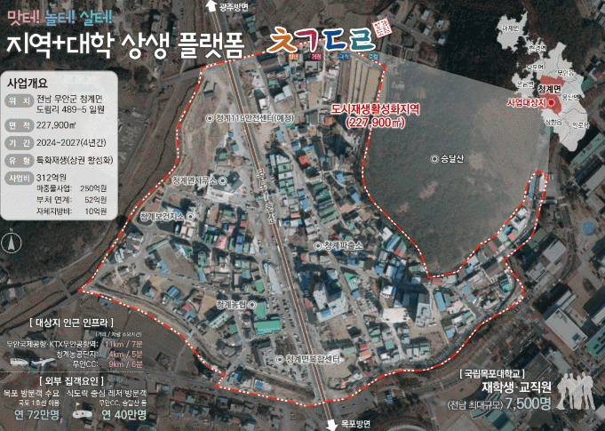 À̹ø¿¡ ¼±Á¤µÈ û°è¸é Áö¿ªÆ¯È µµ½ÃÀç»ý»ç¾÷Àº ¡®Áö¿ª+´ëÇÐ »ó»ý Ç÷§Æû ¤º¤¡¤§¤©[û°èµµ¸²]¡¯À̶ó´Â ºñÀüÀ¸·Î µµ¸²¸® ÀÏ¿ø 227,900§³ÀÇ µµ½ÃÀç»ý Ȱ¼ºÈÁö¿ª¿¡ ³»³âºÎÅÍ 2027³â±îÁö 4³â°£ 260¾ï ¿ø(±¹ºñ 150, µµºñ 25, ±ººñ 85)À» ÅõÀÔÇÏ¿© ´ëÇÐÀÚ¿ø¡¤Áö¿ª ÄÜÅÙÃ÷ ¿¬°è ¹× û³â¡¤Áö¿ª±â¾÷¡¤ÀåÀÎÀÌ ÇÔ²²ÇÏ´Â Áö¿ª Ư»ê¹° Ȱ¿ë ½ÄÀ½·á(F&B) ÄÜÅÙÃ÷ °ÅÁ¡½Ã¼³°ú ƯȰŸ® Á¶¼º µîÀ¸·Î ¹æ¹®°´ À¯ÀÎ ¹× »ó±Ç Ȱ¼ºÈ¸¦ µµ¸ðÇϱâ À§ÇÑ »ç¾÷À» ÃßÁøÇÏ°Ô µÈ´Ù.