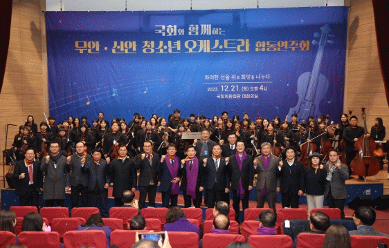 À̳¯ ¹«¾È±º ²ÞÀÇ ¿ÀÄɽºÆ®¶ó´Ü°ú ½Å¾È±º 1004 û¼Ò³â ¿ÀÄɽºÆ®¶ó´Ü 150¿© ¸íÀÇ ´Ü¿øÀº ±¹È¸ÀÇ¿øÈ¸°ü ´ëȸÀǽǿ¡¼ ¡®È·ÁÇÑ ¼±À² À§·Î Èñ¸ÁÀ» ³ª´©´Ù¡¯¶ó´Â ÁÖÁ¦·Î °¢ÀÚÀÇ Àç´ÉÀ» »Ë³»¸ç 12°îÀÇ ¾Æ¸§´Ù¿î °îÀ» ¿¬ÁÖÇß´Ù.