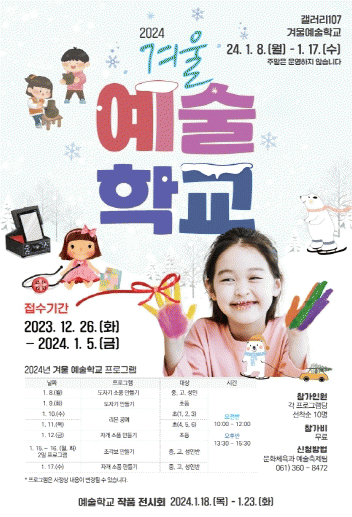 À̹ø ¿¹¼úÇб³´Â 2024³â 1¿ù 8ÀϺÎÅÍ 1¿ù 17ÀϱîÁö °î¼ºÀ¾ Á߾ӷο¡ À§Ä¡ÇÑ ¡®°¶·¯¸® 107¡¯¿¡¼ ÁøÇàÇϸç, °Ü¿ï ¹æÇÐ µ¿¾È Áö¿ª û¼Ò³â°ú ¼ºÀÎ µî 200¸íÀ» ´ë»óÀ¸·Î ´Ù¾çÇÑ ¿¹¼ú Ȱµ¿ °æÇèÀ» Á¦°øÇÑ´Ù.