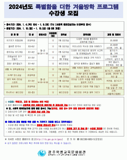 ±¤ÁÖÇлý±³À°¹®Èȸ°ü ±è¿ëÀÏ °üÀåÀº ¡°Ã»¼Ò³âµéÀÇ Ã¢ÀǷ°ú »ó»ó·ÂÀ» ÁõÁø ½Ãų ¼ö ÀÖ´Â ´Ù¾çÇÏ°í ¾ËÂù ÇÁ·Î±×·¥À» ¿î¿µÇÏ¿© ¹®È¿¹¼ú±³À°ÀÇ ÀåÀ» Á¦°øÇϰڴ١±¸ç ¡°±ä °Ü¿ï¹æÇÐÀ» Ȱ¿ëÇØ Âü¿©ÇÔÀ¸·Î½á ¾ÆÀ̵éÀÌ Æ¯º°ÇÑ ÀÏÁÖÀÏÀ» º¸³¾ ¼ö Àֱ⸦ ¹Ù¶õ´Ù¡±¶ó°í ¸»Çß´Ù.