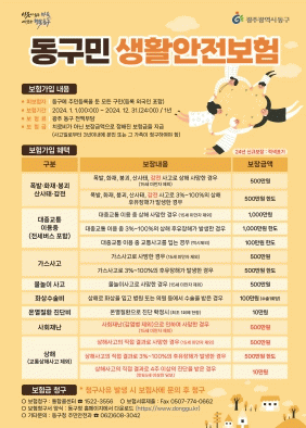 ¡®µ¿±¸¹Î »ýȰ¾ÈÀüº¸Ç衯Àº ÀÏ»ó»ýȰ¿¡¼ ¿¹±âÄ¡ ¾Ê°Ô ÀϾ ¼ö ÀÖ´Â °¢Á¾ Àç³°ú »ç°í·ÎºÎÅÍ ÀÎÀû »ç°í ÇÇÇØ¸¦ ÀÔÀº ÁÖ¹ÎÀÇ Á¶¼ÓÇÑ »ýȰ ¾ÈÁ¤À» À§ÇØ ¿î¿µ ÁßÀÌ´Ù. °¡ÀÔ ´ë»óÀº µî·Ï¿Ü±¹ÀÎÀ» Æ÷ÇÔÇØ µ¿±¸¿¡ Áֹεî·ÏÀ» µÐ ¸ðµç ÁÖ¹ÎÀ¸·Î º°µµ ÀýÂ÷ ¾øÀÌ ÀüÀÔ¡¤ÀüÃ⠽à ÀÚµ¿À¸·Î °¡ÀÔ¡¤Å»Åð 󸮵ȴÙ.