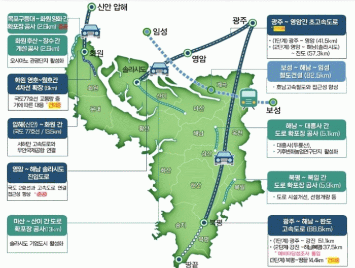 °ü³» Áö¹æµµ 806È£¼±ÀÎ ¸¶»ê~»êÀ̰£ Áö¹æµµ È®Æ÷Àå°ø»ç´Â »ç¾÷ºñ 1,439¾ï¿øÀ» ÅõÀÔ, 16.7km¸¦ ½Ã¼³ÇÏ´Â °ø»ç·Î, ¼³°è°¡ ¿Ï·áµÇ¾î 2024³â¿¡ ÃßÁø µÉ ¼ö ÀÖµµ·Ï Àü¶ó³²µµ¿¡ Áö¼ÓÀûÀ¸·Î °ÇÀÇÇϰí ÀÖ´Ù. Á¶±â Âø°ø ½Ã È¿ø ÀϹݻê¾÷´ÜÁö ÇØ»ódz·ÂŬ·¯½ºÅÍ Á¶¼ºÀ¸·Î ÀÎÇÑ ¹°·ù·® Áõ°¡¿¡ µû¸¥ ÀÎÇÁ¶ó ±¸Ãà°ú ½Ã³ÊÁö È¿°ú°¡ ±Ø´ëÈµÇ¸ç ¿À½Ã¾Æ³ë °ü±¤´ÜÁö, ¼Ö¶ó½Ãµµ ±â¾÷µµ½Ã Ȱ¼ºÈ¿¡ ¼Óµµ¸¦ ³ôÀÏ Àü¸ÁÀÌ´Ù.