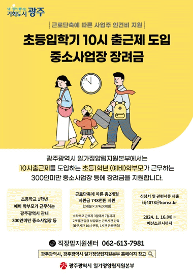 ±¤Áֽà Àϰ¡Á¤ ¾ç¸³ Áö¿øÁ¤Ã¥ÀÎ ¡®Ãʵî1Çгâ Çкθð 10½Ã Ãâ±ÙÁ¦ µµÀÔ Áß¼Ò»ç¾÷Àå Àå·Á±Ý Áö¿ø »ç¾÷¡¯Àº 300ÀÎ ¹Ì¸¸ Áß¼Ò»ç¾÷Àå¿¡¼ ±Ù¹«ÇÏ´Â Ãʵî 1Çгâ Çкθð ±Ù·ÎÀÚ°¡ ÀÔÇбâ(3~7¿ù)¿¡ ÃÖ´ë 2°³¿ù°£ Ãâ±Ù½Ã°£À» 1½Ã°£ ´ÊÃâ ¼ö ÀÖµµ·Ï Áö¿øÇÏ´Â »ç¾÷ÀÌ´Ù.