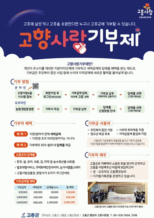 °íÇâ»ç¶û±âºÎÁ¦´Â °³ÀÎÀÌ Áֹεî·Ï»ó ÁÖ¼ÒÁö¸¦ Á¦¿ÜÇÑ ÁöÀÚü¿¡ ¿¬°£ 500¸¸¿ø ³»¿¡¼ ±âºÎ °¡´ÉÇϸç, ±âºÎ±ÝÀº ÇØ´ç Áö¿ª ÁֹεéÀÇ º¹¸®ÁõÁø¿¡ »ç¿ëµÇ°í ±âºÎÀÚ´Â ¼¼¾×°øÁ¦¿Í ´ä·ÊǰÀ» ¹ÞÀ» ¼ö ÀÖ´Ù.