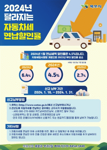 ¿¬³³½ÅûÀº 2024³â 1¿ù ÇöÀç ¸ñÆ÷½Ã¿¡ µî·ÏµÈ Â÷·® ¼ÒÀ¯ÀÚ·Î ¸ñÆ÷½Ãû ¼¼Á¤°ú·Î ÀüÈ ¶Ç´Â ¹æ¹® ½ÅûÇϰųª À§Åýº, ¸ð¹ÙÀÏÀ» ÀÌ¿ëÇÏ¿© ½Åû ¹× ³³ºÎ°¡ °¡´ÉÇÏ´Ù. ¼ÛºÎµÈ ¿¬³³ ³³ºÎ¼¿¡ µû¶ó ³³ºÎÇÏÁö ¾Ê¾Æµµ Á¤±â³³ºÎ ±â°£(6¿ù, 12¿ù)¿¡ ÀÚµ¿Â÷¼¼¸¦ ³³ºÎÇÒ ¼ö ÀÖ´Ù.