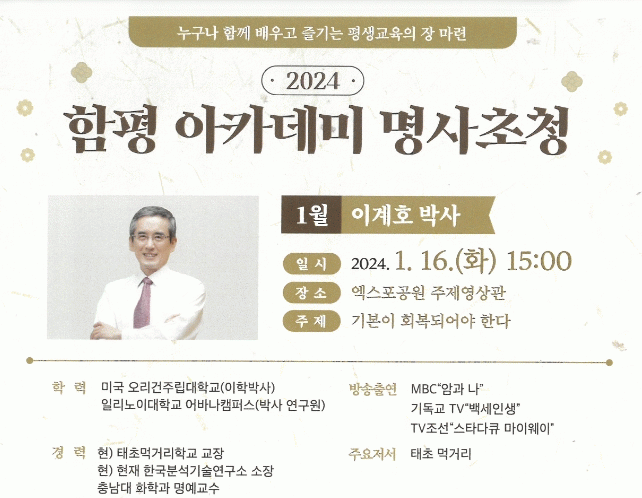 ¿ÃÇØ ù ¹øÂ° °¿¬ÀÚ·Î´Â Ãæ³²´ëÇб³ À̰èÈ£ ±³¼ö¸¦ ÃÊûÇß´Ù. À̰èÈ£ ±³¼ö´Â ¾Ï ¿¹¹æ ¹× Ä¡·á, °Ç°ÇÑ »ýȰ½À°ü¿¡ ´ëÇÑ Æø³ÐÀº Àü¹® Áö½ÄÀ» °®Ãá Àι°·Î, '¹°¹Ú»ç'¿Í '°Ç°Àüµµ»ç'·Îµµ ³Î¸® ¾Ë·ÁÁ® ÀÖ´Ù.