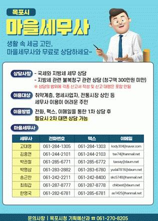 ¸ñÆ÷½Ã Á¦5±â ¸¶À»¼¼¹«»ç´Â 7¸íÀ¸·Î ¼¼¹« »ó´ãÀ» ¿øÇÏ´Â ½Ã¹ÎÀº ÇàÁ¤¾ÈÀüºÎ ¹× ½Ã ȨÆäÀÌÁö¿¡¼ °¡±îÀÌ ÀÖ´Â ¸¶À»¼¼¹«»ç¸¦ È®ÀÎÇØ »ó´ãÀ» ½ÅûÇÏ¸é µÈ´Ù.