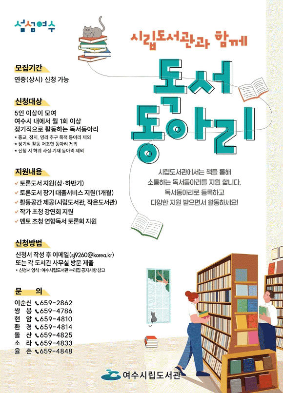 ¿©¼ö½Ã´Â µî·ÏµÈ µ¿¾Æ¸®¿¡ ¡ãµµ¼°ü ³» Ȱµ¿ °ø°£ Á¦°ø ¡ãÅä·Ð µµ¼ Àå±â´ëÃâ(1°³¿ù) ¡ãµ¿¾Æ¸® ¼±Á¤ µµ¼ ¡ãÀÛ°¡ ÃÊû °¿¬È¸ ¡ã¸àÅä ÃÊû ¿¬ÇÕ µ¶¼Åä·Ðȸ Áö¿ø µîÀÇ ÇýÅÃÀ» Á¦°øÇÒ ¿¹Á¤ÀÌ´Ù.