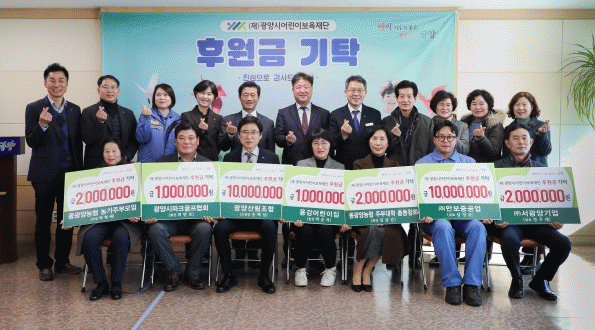 À̹ø¿¡ ±âŹµÈ ±â±ÝÀº ±¤¾ç½Ã»ê¸²Á¶ÇÕ 1õ¸¸¿ø, (ÁÖ)¸¸º¸Áß°ø¾÷ 1õ¸¸¿ø, µ¿±¤¾ç³óÇù ³ó°¡ÁֺθðÀÓ 2¹é¸¸¿ø, µ¿±¤¾ç³óÇù ÁֺδëÇÐ Ãѵ¿Ã¢È¸ 2¹é¸¸¿ø, ¢ß¼±¤¾ç±â¾÷ 2¹é¸¸¿ø, ±¤¾ç½ÃÆÄÅ©°ñÇÁÇùȸ 1¹é¸¸¿ø, ¿ë°¾î¸°ÀÌÁý 1¹é¸¸¿ø µî ÃÑ 2õ8¹é¸¸¿øÀÌ´Ù.