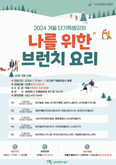 ¡®³ª¸¦ À§ÇÑ ºê·±Ä¡ ¿ä¸®¡¯ ÁÖÁ¦·Î ¿¸®´Â À̹ø °Á´ Áö¿ªÁֹΠ32¸íÀ» ´ë»óÀ¸·Î ¿î¿µ ±â°£ Áß ¸ÅÁÖ ¼ö¿äÀÏ ¿ÀÀü 10½ÃºÎÅÍ ¿ÀÈÄ 1½Ã±îÁö ÃÑ 5ȸ¿¡ °ÉÃÄ ¡®±¤Áֽà ¹«Çü¹®ÈÀç Á¦17È£(³²µµÀÇ·ÊÀ½½ÄÀå)¡¯ À̼öÀÚÀÎ ÀÓ¿µ¶õ °»çÀÇ ´Ù¾çÇÑ Ç»Àü ¿ä¸® À̷аú ½Ç½À ÇÁ·Î±×·¥À¸·Î ÁøÇàµÈ´Ù.