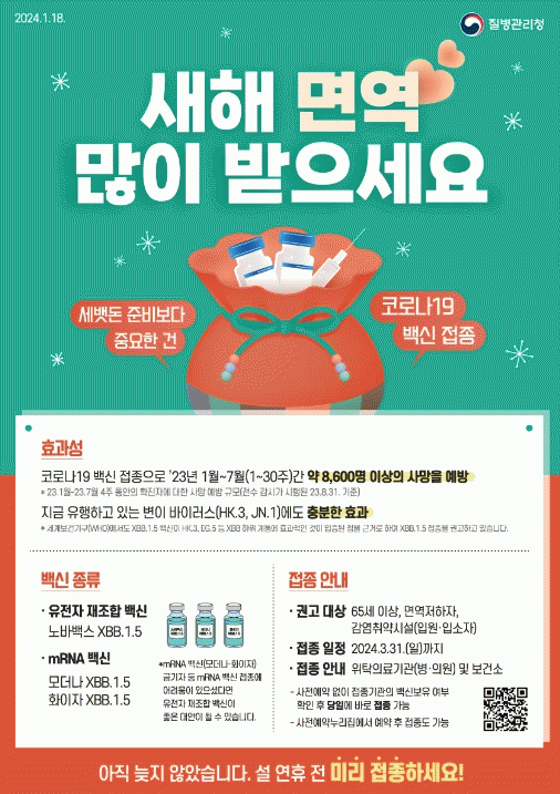 °¡Á·¡¤Ä£Áö¿ÍÀÇ ¸¸³²ÀÌ ÀæÀº ¼³ ¸íÀý¿¡´Â Äڷγª19 °¨¿° À§Çè Áõ°¡°¡ ¿¹»óµÈ´Ù. ƯÈ÷ 65¼¼ ÀÌ»ó °í·ÉÃþ°ú °¨¿°Ãë¾à½Ã¼³ ±¸¼º¿ø Áß Äڷγª19 ½Å±Ô ¹é½Å(XBB.1.5 ±â¹Ý)À» Á¢Á¾ÇÏÁö ¾Ê¾Ò´Ù¸é °¨¿° ¿¹¹æÀ» À§ÇØ Á¢Á¾ÀÌ ÇÊ¿äÇÏ´Ù.