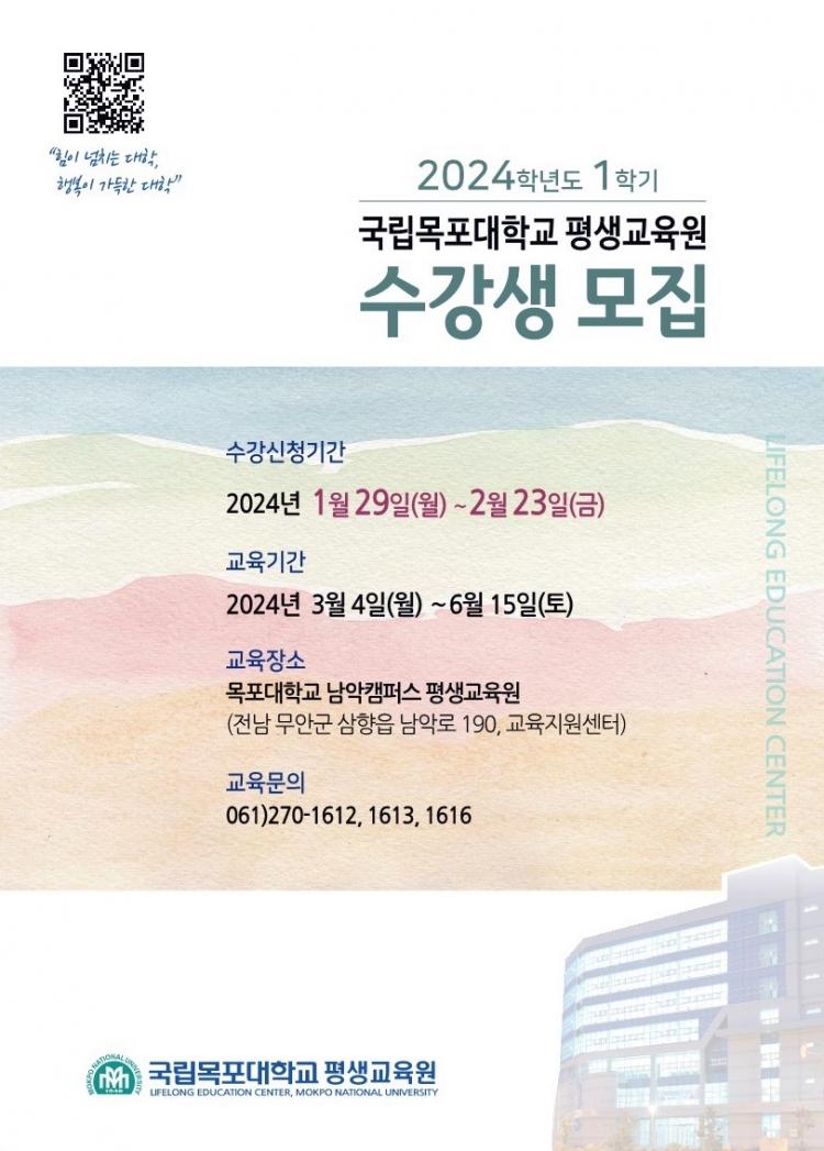 ±¹¸³¸ñÆ÷´ë Æò»ý±³À°¿ø ¼ö°½Åû Á¢¼ö´Â ȨÆäÀÌÁö(http://cec.mokpo.ac.kr), ÀüÈ ¶Ç´Â ¹æ¹®Á¢¼ö(±¹¸³¸ñÆ÷´ë ³²¾ÇÄ·ÆÛ½º 2Ãþ Æò»ý±³À°¿ø: ¹«¾È±º »ïÇâÀ¾ ³²¾Ç·Î 190)·Î °¡´ÉÇϸç, ÀÚ¼¼ÇÑ ³»¿ëÀº ±¹¸³¸ñÆ÷´ë Æò»ý±³À°¿ø ÇàÁ¤½Ç(061-270-1612~3)·Î ¹®ÀÇÇÏ¸é µÈ´Ù.