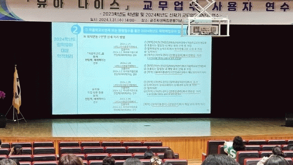 ±³À°¿¬±¸Á¤º¸¿ø¿¡ µû¸£¸é À̹ø ¿¬¼ö´Â ±³¹«¾÷¹«¸¦ ¸Ã°í ÀÖ´Â À¯Ä¡¿ø ±³Á÷¿øµé¿¡°Ô ¼¼ºÎ ¾÷¹«º° Àü»ê ½Ã½ºÅÛ »ç¿ë ¹æ¹ýÀ» ¼Ò°³Çϱâ À§ÇØ ±âȹµÆ´Ù. 2023Çг⵵ ±³¹«¾÷¹«¸¦ Á¤¸®Çϰí 2024Çг⵵ ½ÅÇб⸦ ÁغñÇÏ´Â ½Ã±â¿¡ ÇÊ¿äÇÑ ³»¿ëÀ¸·Î ±¸¼ºµÅ ¼±»ý´Ôµé¿¡°Ô Å« µµ¿òÀÌ µÉ °ÍÀ¸·Î º¸ÀδÙ.