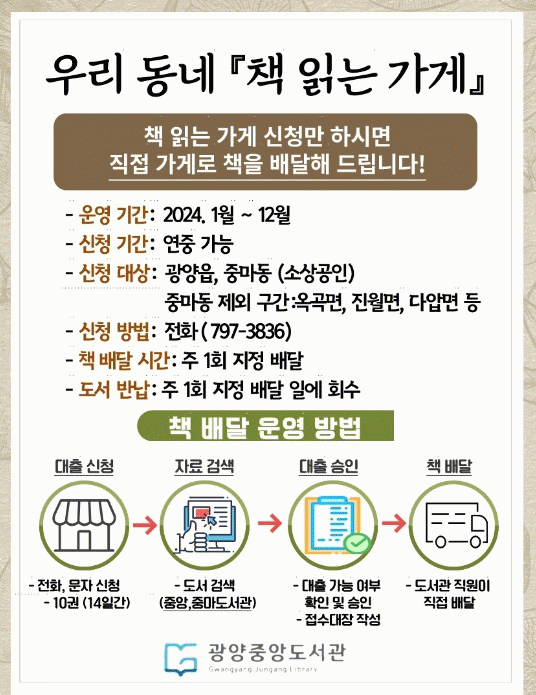 ±¤¾ç½Ã¸³µµ¼°üÀº 2024³â¿¡µµ 'Ã¥ Àд °¡°Ô'¸¦ ´õ¿í È®´ëÇϱâ·Î Çϰí, ¿¬Áß ¼ö½Ã·Î'Ã¥ Àд °¡°Ô' Ãß°¡ ½ÅûÀ» ¹Þ°í ÀÖ´Ù.