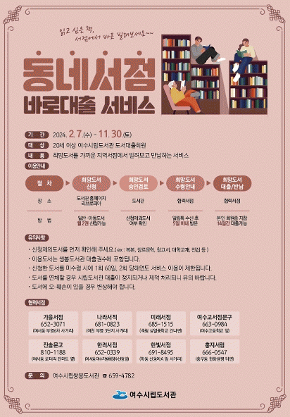 ÀÌ¿ë ¹æ¹ýÀº ¿©¼ö½Ã¸³µµ¼°ü ȨÆäÀÌÁö(yslib.yeosu.go.kr) ¶Ç´Â ¸ð¹ÙÀÏ ¾Û ¡®¸®ºê·ÎÇǾơ¯¿¡¼ Èñ¸Áµµ¼ ½Åû ÈÄ ¾Ë¸²ÅåÀ¸·Î ¼ö·É ¾È³»¸¦ ¹ÞÀ¸¸ç, µµ¼´ëÃâȸ¿øÁõÀ» ÁöÂüÇϰí ÇØ´ç ¼Á¡¿¡¼ Á÷Á¢ ´ëÃ⡤¹Ý³³ÇÏ¸é µÈ´Ù.