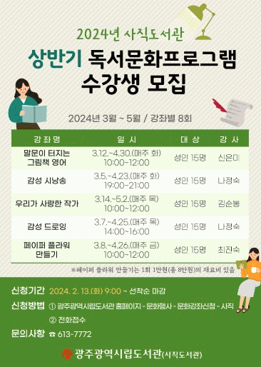 »ó¹Ý±â µ¶¼¹®È °ÁÂÀÇ ¼ö°·á´Â ¹«·áÀ̸ç, Àç·áºñ¿Í ±³Àçºñ´Â ¼ö°»ýÀÌ ºÎ´ãÇÑ´Ù. °Á ¼ö°À» Èñ¸ÁÇÏ´Â ½Ã¹ÎÀº 13ÀϺÎÅÍ ±¤ÁÖ±¤¿ª½Ã¸³µµ¼°ü ´©¸®Áý ¡®¹®È°Á½Åû¡¯¶õÀ» ÅëÇØ Á¢¼öÇÏ¸é µÈ´Ù.