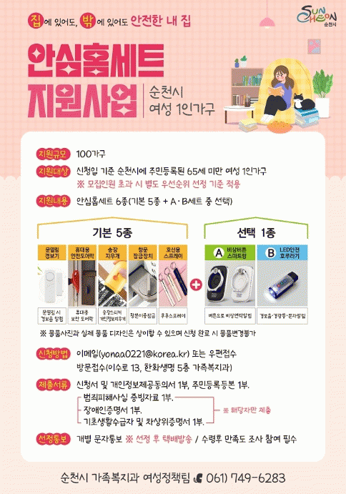 ¿©¼º 1Àΰ¡±¸ ¾È½É Ȩ¼¼Æ®´Â ±âº» 5Á¾(¹®¿¸²°æº¸±â, ÈÞ´ë¿ë¾ÈÀüµµ¾î¶ô, ¼ÛÀåÁö¿ì°³, â¹®Àá±ÝÀåÄ¡, È£½Å¿ë½ºÇÁ·¹ÀÌ)°ú ¼±Åà 1Á¾(ºñ»ó¹öư½º¸¶Æ®¸µ ¶Ç´Â LED¾ÈÀüÈ£·ç¶ó±â)À¸·Î ÃÑ 6Á¾ ¼¼Æ®¸¦ Áö¿øÇÑ´Ù.