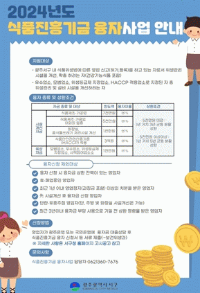 ½ÄǰÁøÈï±â±Ý À¶ÀÚ Áö¿ø»ç¾÷Àº ¿µ¾÷Àå, Á¶¸®Àå, ÈÀå½Ç µî ½ÄǰÀ§»ý ¼öÁØ Çâ»óÀ» À§ÇÑ ½Ã¼³°³¼±Àڱݰú ¿ì¼ö¾÷¼Ò, ¸ð¹ü¾÷¼Ò, À§»ýµî±Þ ÁöÁ¤¾÷¼Ò µî À°¼ºÀ» À§ÇÑ ÀÚ±ÝÀ¸·Î ³ª´²Áø´Ù.