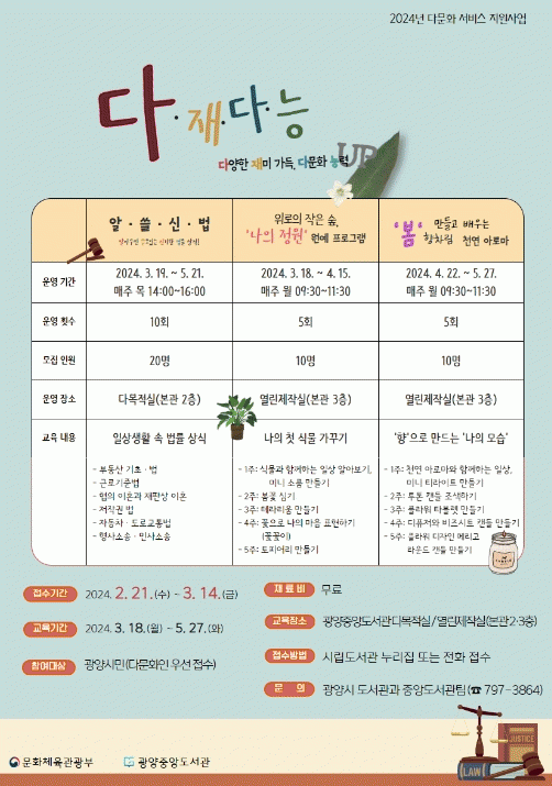 À̹ø »ç¾÷Àº '´Ù¡¤À硤´Ù¡¤´É'(´Ù¾çÇÑ Àç¹Ì °¡µæ, ´Ù¹®È ´É·Â UP)À» ÁÖÁ¦·Î »ýȰ ¹ý·ü °ÁÂ¿Í ¿ø¿¹, ¾Æ·Î¸¶ üÇè °Á ±×¸®°í Áö¿ªÁֹΰú ÇÔ²²ÇÏ´Â ¼ö°»ý ÀÛǰ Àü½Ãȸ ¹× ÇѸ¶´ç Çà»ç·Î ±¸¼ºµÅ ÁøÇàÇÒ °èȹÀÌ´Ù.