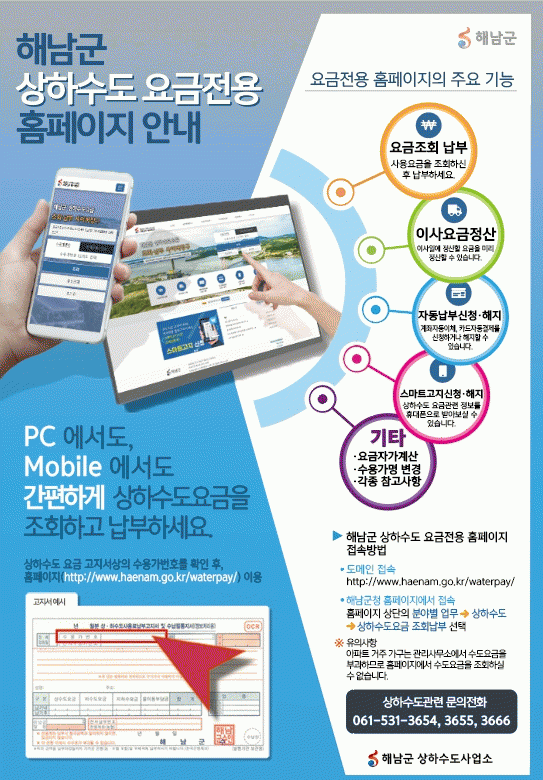 ÇØ³²±º »óÇϼöµµ¿ä±Ý Á¶È¸¡¤³³ºÎ »çÀ̹öⱸ¿¡¼´Â ¼ö¿ë°¡ÀÇ ÁÖ¼Ò¸¦ ÀÔ·ÂÇϸé, ÄÄÇ»Åͳª ½º¸¶Æ®ÆùÀ¸·Î °£ÆíÇÏ°Ô ¼öµµ ¿ä±ÝÀ» Á¶È¸ÇÏ°í ³³ºÎÇÒ ¼ö ÀÖ´Ù.
