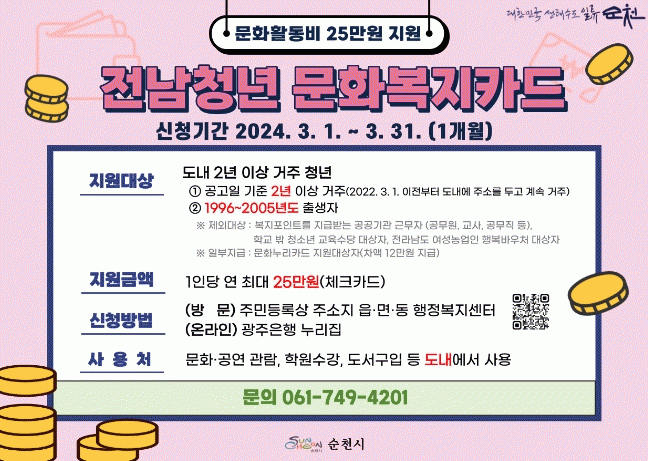 Àü³²Ã»³â ¹®Èº¹ÁöÄ«µå´Â ¼øÃµ½Ã¿¡ °ÅÁÖÇϴ û³â¿¡°Ô °ø¿¬°ü¶÷, Çпø¼ö°, µµ¼±¸ÀÔ µî ¹®Èº¹Áöºñ¸¦ Áö¿øÇÏ´Â »ç¾÷À¸·Î ¿ÃÇØ¿¡´Â 2023³âµµ ´ëºñ 5¸¸¿ø Áõ¾×µÈ 1ÀÎ´ç ¿¬ ÃÖ´ë 25¸¸¿øÀ» Áö¿øÇÑ´Ù.