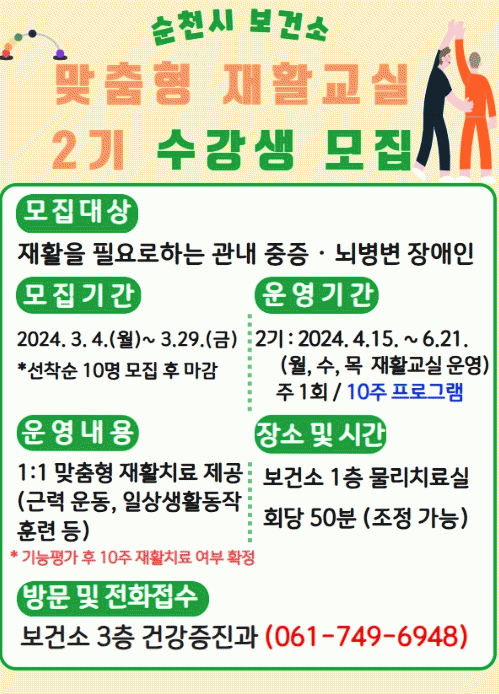 ÀçȰ ¿îµ¿ ¼ºñ½º´Â ¸ÅÁÖ 1ȸ, 10ÁÖ °ÉÃÄ º¸°Ç¼Ò ¹°¸®Ä¡·á½Ç¿¡¼ ÁøÇàµÈ´Ù.