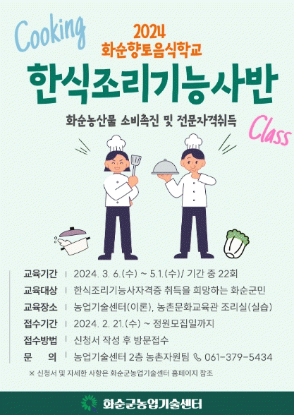 ÇѽÄÁ¶¸®±â´É»ç ¹ÝÀº 3¿ù 6ÀÏ °³°ÇÏ¿© 5¿ù 1ÀϱîÁö ÃÑ 22ȸ(ÁÖ 3ȸ) 3½Ã°£¾¿ ÁøÇàµÇ¸ç ±³À° ³»¿ëÀº ½ÄǰÀ§»ý, ¾ÈÀü°ü¸® µî À̷б³À°°ú µÎºÎÁ¶¸², ´õ´ö±¸ÀÌ µî 33Á¾ ½Ç±â±³À°À¸·Î ÇѽÄÁ¶¸®±â´É»ç ÀÚ°ÝÁõ ÃëµæÀ» À§ÇØ ¹Ýµå½Ã ¾Ë¾Æ¾ß ÇÒ ³»¿ëÀ¸·Î ÁøÇàµÉ ¿¹Á¤ÀÌ´Ù.