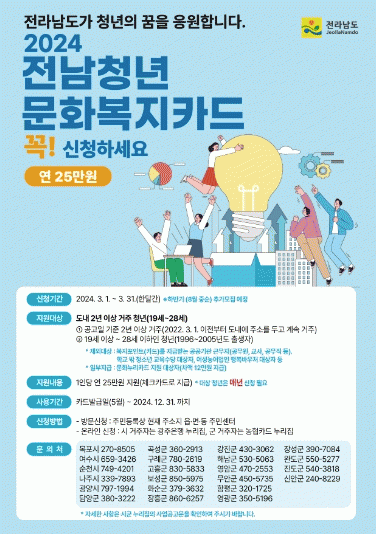 ¡®Àü³² û³â ¹®Èº¹ÁöÄ«µå Áö¿ø»ç¾÷¡¯Àº Àü¶ó³²µµ ³» °ÅÁÖÇϴ û³âÀÇ ¹®È»ýȰ ÇâÀ¯¿Í Àڱ⠰è¹ß ±âȸ¸¦ Á¦°øÇÏ¿©, û³â¼¼´ë Á¤ÂøÀ» µ½±â À§ÇØ ¹®Èº¹Áöºñ¸¦ Áö¿øÇÏ´Â »ç¾÷À¸·Î À۳⺸´Ù 5¸¸ ¿ø Áõ¾×ÇÏ¿© ¿ÃÇØºÎÅÍ´Â ¿¬ 25¸¸ ¿øÀ» Áö¿øÇÑ´Ù.