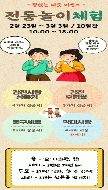 ÃàÁ¦ÀåÀ» ãÀº °ü±¤°´µé¿¡°Ô Çѱ¹ÀüÅë¹®ÈÀÇ ÀÌÇØ¿Í Ä£¹Ð°¨À» ³ôÀ̰íÀÚ ¸¶·ÃÇÑ À̹ø ÀüÅë³îÀÌ Ã¼Çè ÇÁ·Î±×·¥Àº À·³îÀÌ, ÅõÈ£³îÀÌ, Á¦±âÂ÷±â, °í¸®´øÁö±â, µüÁöÄ¡±â¿Í ÇÔ²² ´ëº¸¸§À» ¸Â¾Æ LED ÁãºÒ³îÀÌ¿Í Çö´ë½Ä ÆØÀÌ ¸ÞÅ»ºí·¹À̵å üÇèÀ» ´õÇØ ¾î¸°À̵鿡°Ô ´Ù¾çÇÑ Áñ±æ°Å¸®¸¦ Á¦°øÇÒ °èȹÀÌ´Ù.