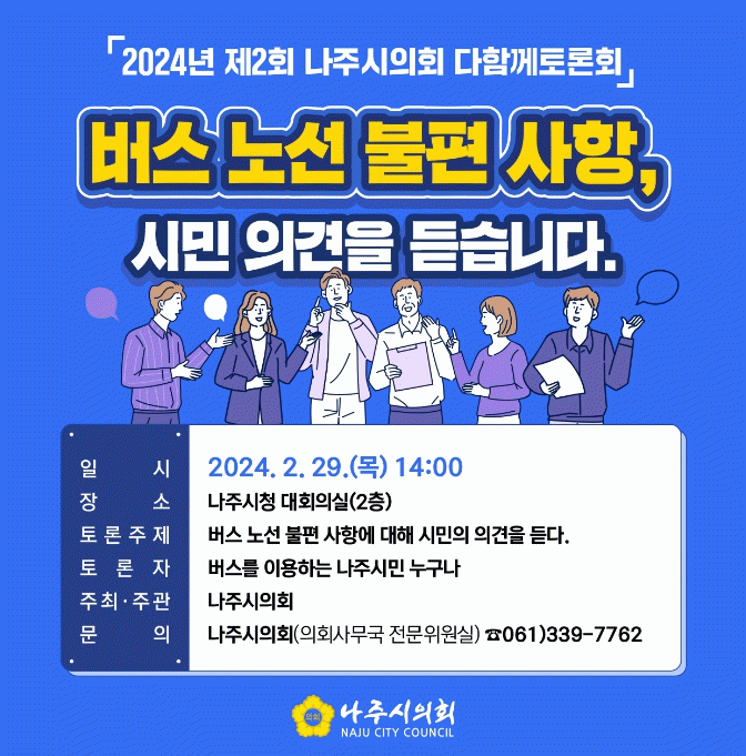 ³ªÁÖ½ÃÀÇȸ´Â Æò¼Ò ÀÇȸ¿¡ Á¢¼öµÈ ¹ö½º ³ë¼± °ü·Ã ºÒÆí »çÇ×°ú Åä·Ðȸ¿¡¼ ³íÀÇÇÑ ½Ã¹ÎµéÀÇ ÀǰßÀ» ¼ö·ÅÇÏ¿© ÁýÇàºÎ¿¡ Àü´ÞÇÔÀº ¹°·Ð ÁÖ¹ÎÀÇ À̵¿±Ç º¸Àå°ú ´ëÁß±³ÅëÀÇ °ø°ø¼º °È¸¦ ¿ä±¸ÇÒ °èȹÀÌ´Ù.