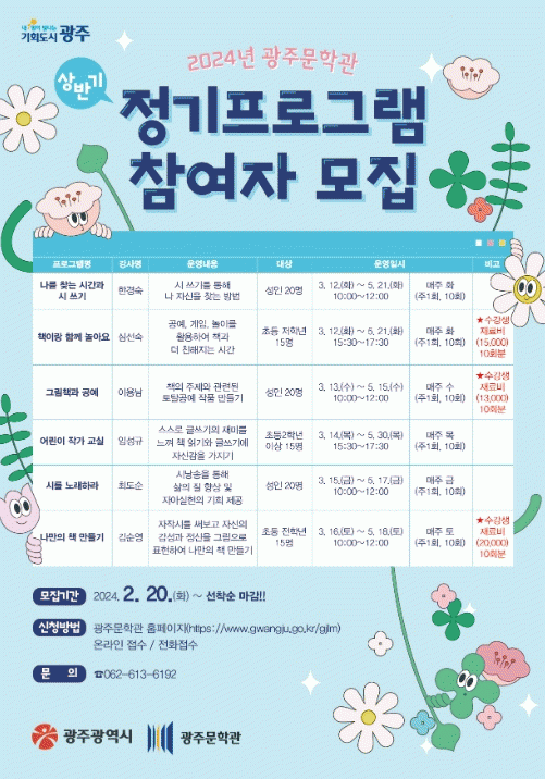 ¡®½Ã âÀÛ¡¯ °Á´ ½Ã¸¦ ÁÁ¾ÆÇϰųª ½ÃÀÎÀÌ µÇ°í ½ÍÀº ¼ºÀÎÀ» ´ë»óÀ¸·Î Çö´ë½Ã âÀÛ ±âÃÊ ÀÌ·Ð ±³À°°ú ½Ã âÀÛ ¼ö¾÷À» ÁøÇàÇÑ´Ù. ¡®±×¸²Ã¥°ú °ø¿¹¡¯ °Á´ ¹®ÇÐ ÀÛǰ°ú °ü·ÃµÈ °ø¿¹ ÀÛǰÀ» ¸¸µç´Ù. ƯÈ÷ ÀÛǰÀ» ¸¸µé¸é¼ ¸ôÀÔ°¨À» °æÇèÇÏ¸ç ½É¸®Àû ¾ÈÁ¤°¨À» µµ¸ðÇÑ´Ù.