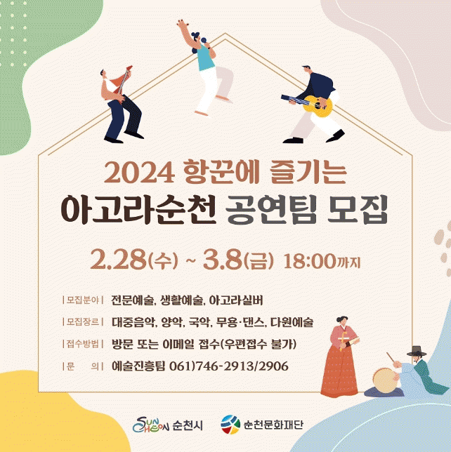 À̹ø °ø¸ð¿¡ Âü¿©¸¦ ¿øÇÏ´Â ¿¹¼ú°¡³ª ¿¹¼ú´Üü´Â ¼øÃµ¹®ÈÀç´Ü ´©¸®Áý¿¡¼ Áö¿ø½Åû¼¸¦ ³»·Á¹Þ¾Æ ÀÛ¼ºÇØ ¼øÃµ¹®ÈÀç´ÜÀ¸·Î ¹æ¹®Çϰųª À̸ÞÀÏ·Î 3¿ù 8ÀÏ 18½Ã±îÁö Á¢¼öÇÏ¸é µÈ´Ù.